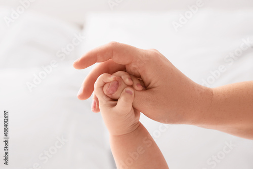 Woman holding her little baby's hand in bedroom, closeup