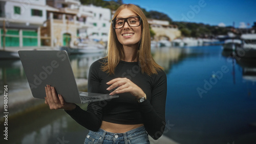 Woman holding laptop with left hand and typing on keyboard with right hand at a marina pier, wearing glasses and black crop top, waterfront buildings and boats behind her; focus productivity.