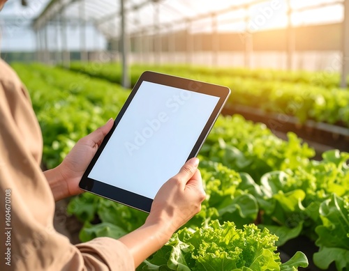 woman, tablet, greenhouse, lettuce, hand, farm, agriculture, technology, produce, garden, growing, plant, crop, fresh, healthy, modern, sustainable, farming, digital, control, environment, sunlight, nature, sharpened, closeup, display