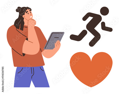 Woman holding tablet, thinking, stylized running figure symbolizing activity, heart icon for health. Ideal for wellness, fitness, health planning, goal setting, decision-making motivation simple