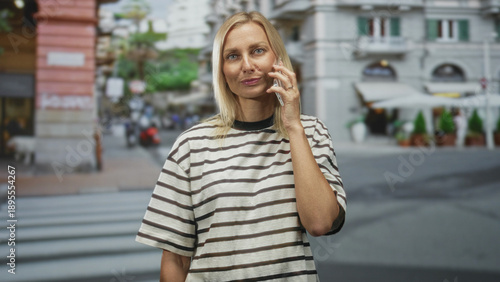 woman, phone, holding, street, female, middle-aged, blond, striped, crosswalk, city, calm, conversation, talking, call, smartphone, shirt, smile, standing, pedestrian, daytime, cafes, awning, building, sidewalk, mobile phone, voice, communication, connection, calling, mobile, interaction, commute, walking, public, ring, jewellery, outdoors, gesture, accessory, sharpened, adult, mature, phone call, signal, hand-held, urban, expression, daylight, informal