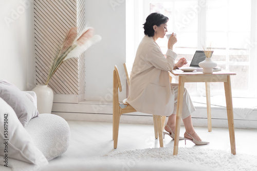 Woman in a beige business suit is typing on a laptop. Sitting at the desk with a cup of coffee. Full lens portrait.