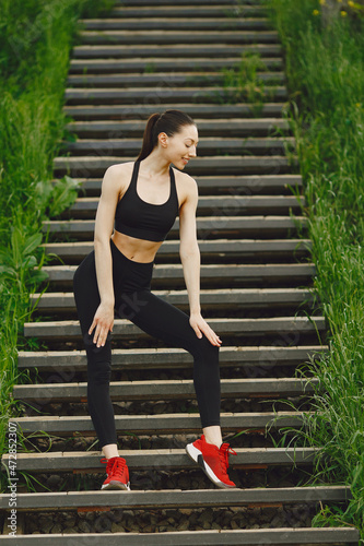 Woman in a black spoerswear standing on a stairs