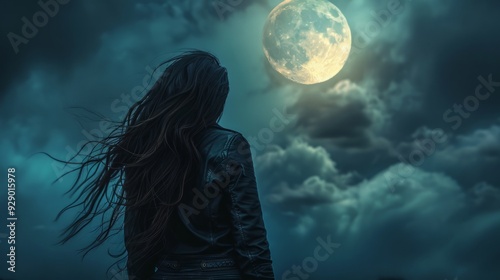 Woman in a leather jacket gazing at a full moon in a cloudy night sky