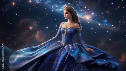woman in a sparkling blue gown stands in a dark forest with glowing mushrooms and fairy lights.