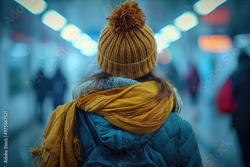 Woman in a Yellow Knitted Hat and Scarf Walking Through a Subway Station
