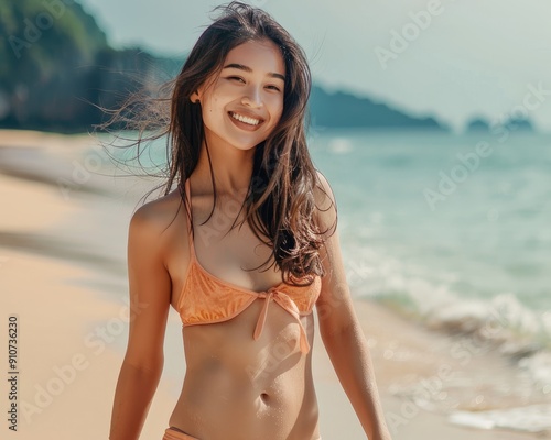 woman, bikini, smiling, beach, ocean, sand, smile, happy, summer, vacation, travel, beautiful, swimwear, model, tropical, water, sun, tan, body, hair, wave, holiday, relaxation, carefree, outdoors, coastline, paradise, lifestyle, fashion, style, portrait, joy, happiness, freedom, nature, seascape, coastal, landscape, gorgeous, gorgeous woman, beach vacation, tropical paradise
