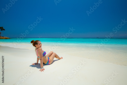 Woman in bikini Sunbathing on the white sandy beach on paradise island. In the Andaman Sea , Thailand