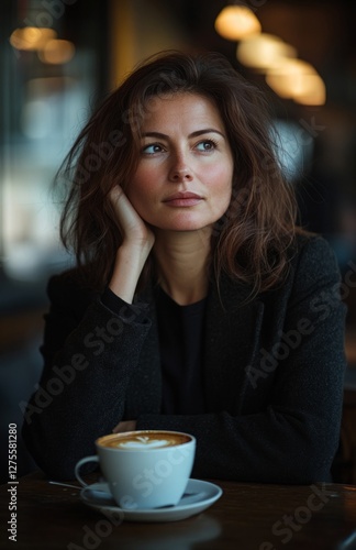 woman, 30s, hot drink, brunette, brown, eye, dark, office, cafes, table, sipping, drink, casual attire, atmosphere, indoor, lifestyle, business, young, adult, working, relaxation, break, modern, shop, professional, solitude, interior, ambience, cup, attire, lover, concentration, cosy, calm, quiet, alone, peaceful, mood, beverage, energy, focused, time