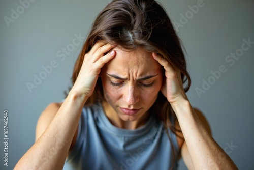 Woman in Pain Holding Head with Blurred Background Creating Vertigo Sensation