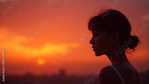 woman, female, portrait, sunset, sunrise, orange, sky, profile, girl, silhouette, dusk, dawn, contemplation, pensive, thinking, thoughtful, serene, peaceful, calm, tranquil, beauty, beautiful, attractive, graceful, elegant, romantic, dreamy, moody, atmospheric, warm, golden hour, evening, daybreak, sun, light, glow, horizon, skyline, city landscape, scenic, view, vista, nature, travel, journey, escape, wellness, well-being