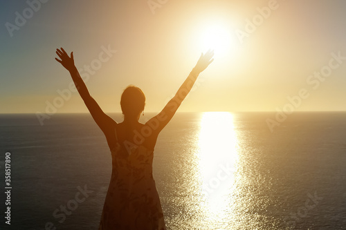 woman, summer, dress, silhouette, raise, hand, racked, endless, ocean, coastline, bright, sun, sunset, tropical, backside, picturesque, seascape, blue, admire, pictorial, sky, beautiful, lady, girl, adult, female, tour tourism, travel, destination, vacation, resort, caucasian, stylish, lifestyle, holiday maker, natural, scenic, scenery, nature, evening, tranquil, path, freedom, stretching, yoga, meditation, new, life, idea, sunlight
