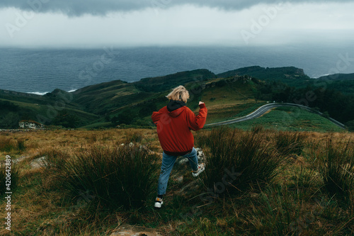 adventure, air, anonymous, apparel, beauty, cliff, coat, cold, countryside, field, fog, freedom, grass, hike, hill, human face, joy, landscape, leisure, lifestyle, mist, mountain, mountain chain, nature, outdoors, peak, pleasure, portrait, road, sky, sleeve, standing, sweater, travel, trip, vegetation, wind, woman, wood, young