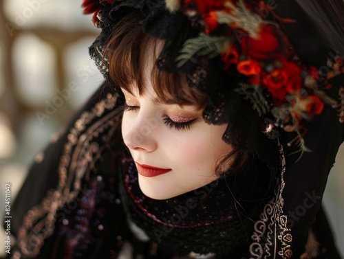 woman, portrait, headpiece, floral, traditional, fashion, beauty, make-up, eyes closed, red lips, dark hair, ornate, decorative, elegant, glamour, style, culture, costume, ethnic, closeup, face, female, model, art, headdress, accessory, ornamental, exotic, vibrant