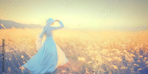 woman, white dress, field, tall grass, sunset, golden hour, nature, landscape, fashion, style, romantic, dreamy, peaceful, serene, elegant, graceful, hat, veil, countryside, rural, meadow, prairie, warm colors, soft light, vintage, retro, idylli, scenic, beautiful, summer, autumn, evening, dusk, horizon, sky, cloud, sunlight, backlighting, silhouette, solitude, freedom, hope, inspiration, adventure, journey