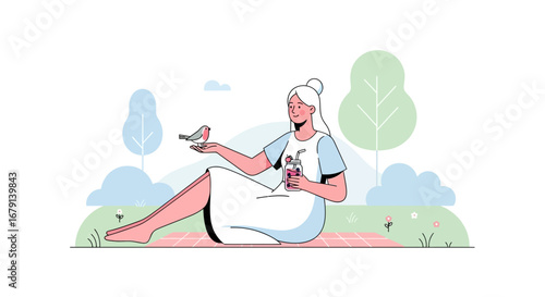 bird, picnic, woman, nature, friendship, beverage, outdoors, relax, summer, colourful, happiness, joy, lifestyle, leisure, harmony, health, fresh, fruit, drink, illustration, field, grass, day, beauty, serene, peaceful, calmness, enjoyment, companion, gentle, avian, flora, sky, simple, style, modern, vector, art, drawing, garden, calm, freedom, well, being