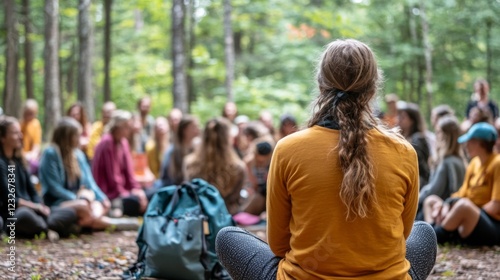 woman, group, forest, nature, sitting, back, meditation, yoga, workshop, gathering, female, people, tree, green, sunlight, relaxation, community, spiritual, wellness, mindfulness, summer, camp, education, learning, teacher, student, class, lesson, instructor, attentive, concentrated, peaceful, serene, calm, tranquil, happy, joyful, smiling, positive, togetherness, connection, support, yellow, grey, backpack