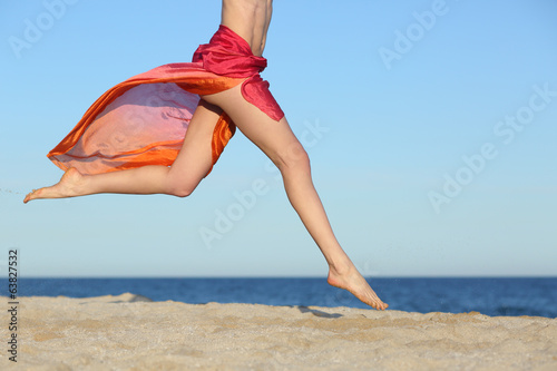 Woman legs jumping on the beach happy