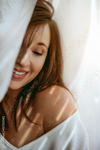 vertical, carefree, clean, indoor, cosy, beauty, woman, portrait, happy, joyful, smiling, smile, make-up, bright, white, curtain, beautiful woman, cheerful, lifestyle, brown hair, brunette, long hair, head, closeup, adult, human face, oklahoma, us, 30s, one person, female