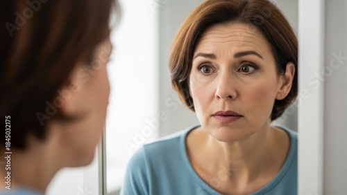 Woman looking in a mirror with a concerned expression, observing wrinkles on her forehead. Concept of aging, self-perception, and cosmetic care.