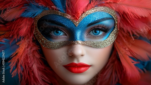 mask, masquerade, woman, feather, face, red, blue, eye, beauty, portrait, carnival, costume, fashion, model, glamour, elegant, mysterious, sensual, artistic, style, make-up, festival, celebration, holiday, party, event, venetian, vintage, retro, fantasy, art, design, photo, image, photo, girl, look, expression, closeup, head shot, gorgeous, attractive