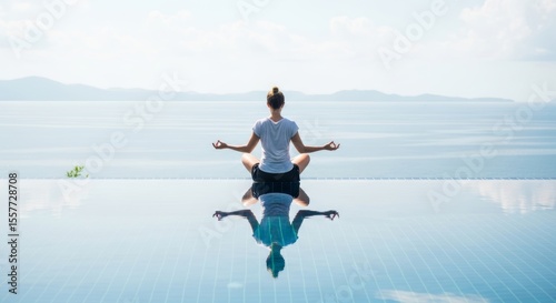 Woman Meditating by Infinity Pool with Ocean View - Peaceful Yoga Practice and Water Reflection
