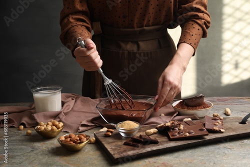 Woman mixing delicious chocolate cream with whisk at grey textured table, closeup