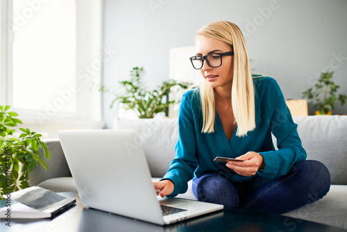 online, shopping, credit card, laptop, woman, sofa, home, apartment, caucasian, blond, goggles, 30s, adult, one person, sitting, cyberspace, e-business, payment, purchasing, technology, lifestyle, indoor, living room, casual clothes, teal, jean, focused, concentration, couch, finance, banking, wireless, notebook, daylight, attractive, using, 1, computer, buying