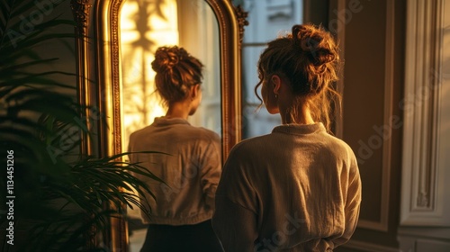 woman, mirror, gold, frame, ornate, interior, room, window, sunlight, back, hair, bun, updo, clothing, shirt, fabric, textured, warm, gold, light, shadow, plant, leaf, green, dark, elegant, style, calm, peaceful