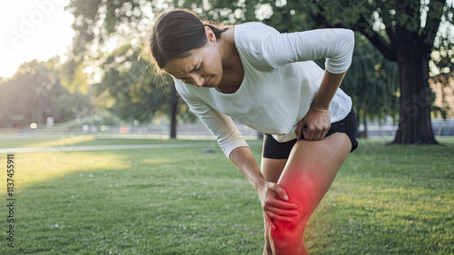 Woman Outdoors in Park During Soft Sunlight, Wearing White Top and Black Shorts, Highlighting Discomfort in Right Leg with Red Glow Indicating Pain or Injury, Early Morning or Late Afternoon Ambiance