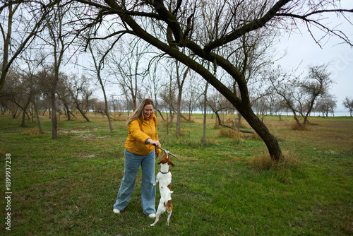 woman, dog, play, jump, jack russell, terrier, pet, autumn, field, outdoors, fall, nature, tree, lake, grass, joyful, happy, interaction, bonding, companionship, young, female, jacket, jean, casual attire, playful, fun, active, lifestyle, season, foliage, leaf, overcast, moody, serene, happiness, wellness, mindfulness, leisure, friendship, animal, canino, portrait, adventure, freedom, energy