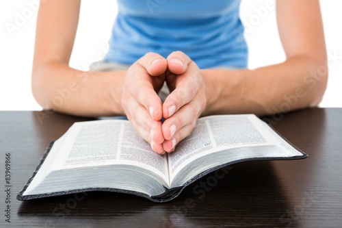 Woman praying while reading bible