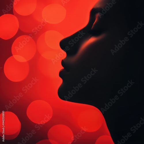 woman, profile, red, face, light, beauty, portrait, dark, night, blurred, shape, silhouette, neck, glow, soft, skin, art, figure, calm, mood, pretty, dreamy, beautiful, head, relax, mystery, bokeh, dream, elegance, romance, nostalgia
