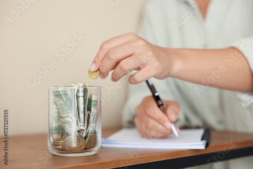 Woman putting money into jar and writing in notebook at wooden table indoors, selective focus