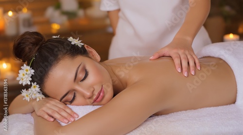 Woman receiving a back massage, lying on a white towel, surrounded by flowers in her hair. Warm candlelight background. Concept of relaxation, spa therapy. Ai generative