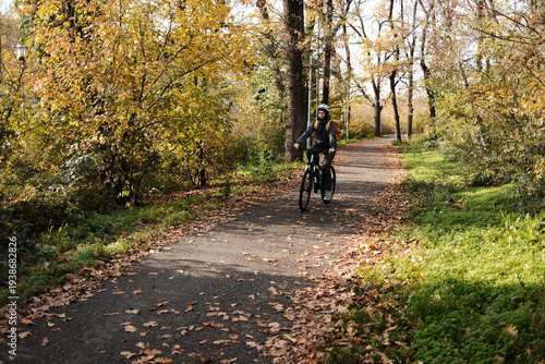 Woman riding bicycle along autumn park path surrounded by golden trees. Active lifestyle and eco friendly transport concept.