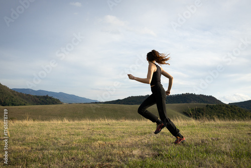 Woman running in nature. Young woman running outdoors in landscape, enjoying fitness, active lifestyle, sports in nature, fresh air, scenic views, healthy energy, wellness.