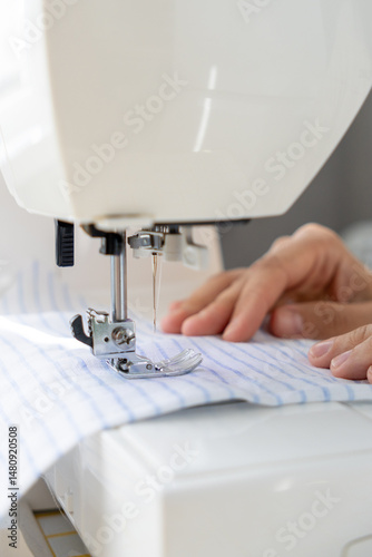 sewing, dress, sewing machine, dressmaker, person, piece, fabric, machine, wearing, white, shirt, tailor, textile, clothes, craft, hand, equipment, thread, working, industry, dressmaker, design, fashion, woman, manufacturing, needle, tool, material, factory, hobby, closeup, seam, stitch, process, manual, garment, female, workshop, occupation, cotton, detail, business, atelier, background, metal, men at work, production, pattern, embroidery, electric