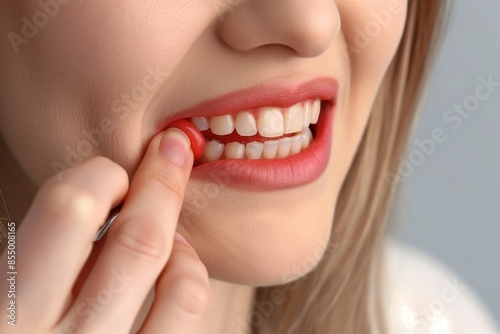 Woman showing inflamed gum on grey background closeup, Closeup of Woman with Inflamed Gum on Grey Background, Signs and Treatment, Understanding Gum Inflammation, Closeup of Woman Showing Symptoms on