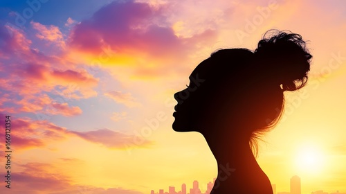 silhouette, woman, sunset, city landscape, cloud, sky, peaceful, meditation, hope, dream, serenity, calm, tranquil, relaxation, inspiration, freedom, beauty, golden hour, profile, female, hair, bun, urban, background, evening, horizon, light, colours, vibrant, city view, sunrise, nature, sky background, city landscape