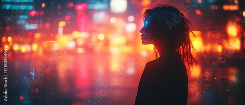 woman, city, night, light, bokeh, urban, futuristic, technology, silhouette, dark, red, orange, blue, glow, mysterious, mood, atmosphere, abstract, background, portrait, female, scene, street, modern, digital, art, illustration, graphic, design, style, vision, future, energy, fantasy, dreamy, enigmatic, intriguing, magical, powerful, solitary, lonely