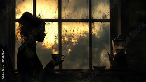 woman, silhouette, hot drink, cup, sunset, window, morning, tea, steam, sunrise, warm, cosy, home, comfort, peaceful, tranquil, serene, calm, quiet, solitude, relaxation, contemplation, thoughtful, dreamy, mysterious, dark, light, shadow, glasses, pane, wood, frame, table, kettle, pot, drink, hot, beverage, autumn, winter, day, evening, view, scene, background, image, art, painting