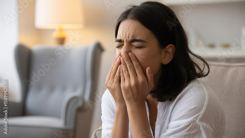 sneeze, allergy, disease, health, unwell, sick, discomfort, ache, pain, suffering, health care, medicine, symptom, reaction, woman, female, portrait, closeup, indoor, home, living room, robe, dark hair, brunette, expression, facial expression, medicals, healthcare professional, allergic, hay fever, virus, contagion, ill, sleepy, exhaustion, stress, fatigue, pressure, bod, body