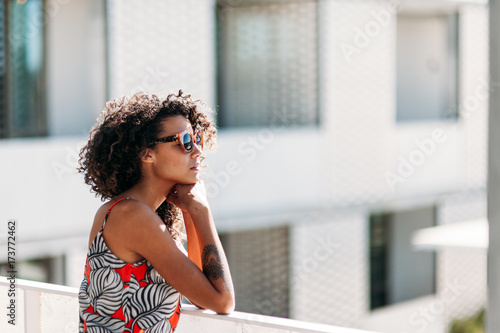 young, woman, warm, vacation, tattoo, sunshine, sunglasses, sun, summer, single, rest, resort, relax, person, morning, hotel, hip, healthy, happy, hair care, hair, curl, confident, confidence, beautiful, balcony, attractive, alternative, mixed race, girl, female, people, adult, adult, 20s, young adult, young adult, young person, grown-up
