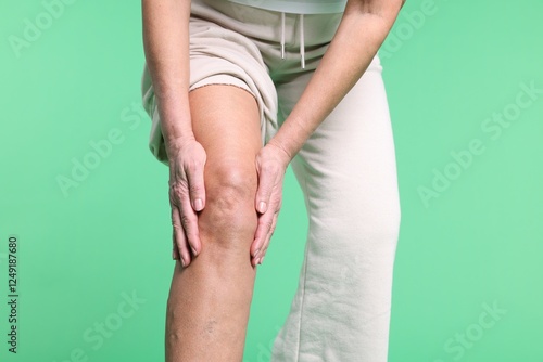 Woman suffering from pain in her knee on green background, closeup