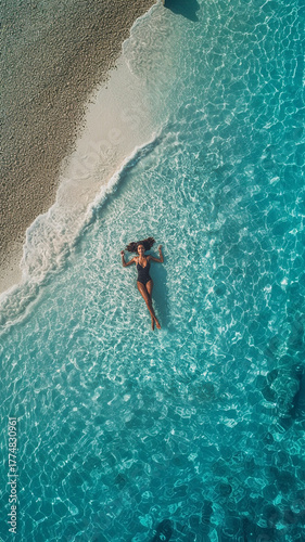 Woman swimming lying on her back in crystal clear turquoise water, top view from a height. Girl with a very beautiful face in a swimsuit enjoying beach vacation. Small ripples on turquoise water