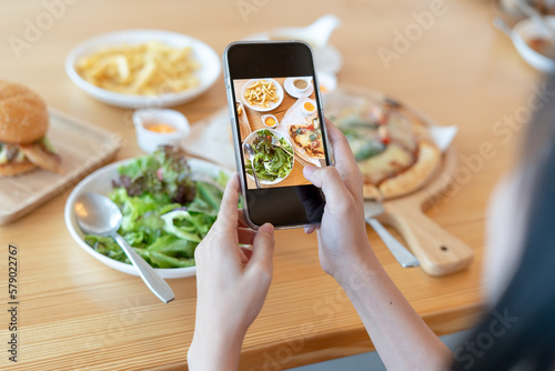 Woman take picture of a meal on the table after ordering food online to eat at home. Photography and use phone concepts