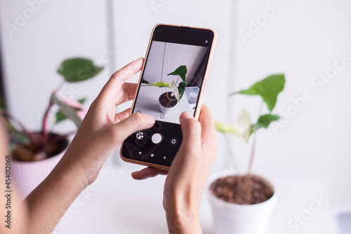 Woman taking a photo beautiful plant in pot with smart phone indoor,House plants