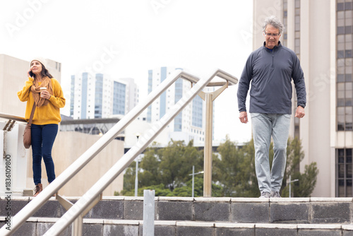 people, smartphone, step, woman, man, urban, mobility, lifestyle, casual attire, communication, fitness, copy space, mature, adult, hispanic, latino, white, talking, walking, descending, piazza, concrete, balustrade, hot drink, take-away, mustard, sweater, jean, pullover, sneaker, boot, casual clothes, activewear, office, residential, building, tree, overcast, cloudy, pedestrian, modern, multistorey, city, urban area, street, relaxed