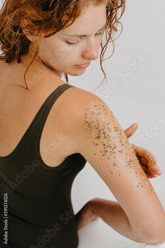 scrub, body, hot drink, skin, care, woman, beauty, natural, eco, white, female, healthy, closeup, clean, background, person, shoulder, health care, skincare, view, young, cosmetic, relax, relaxation, hand, massage, clear, towel, adult, beautiful, finger, caucasian, back, bathe, girl, sugar, portrait, health, freshness, jar, cream, homemade, product, oil, shower, wellness, spa, brown, ground, spoon